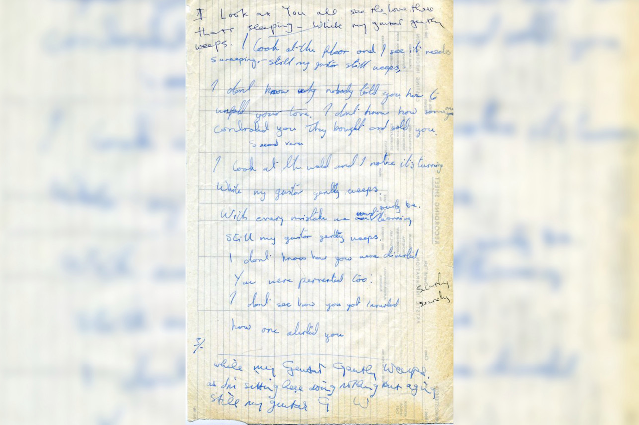 George and Ringo drafted the lyrics on the back of a studio recording sheet, used to account for the time and cost of a recording session while recording the “White Album” at EMI’s Abbey Road Studios in London in 1968.